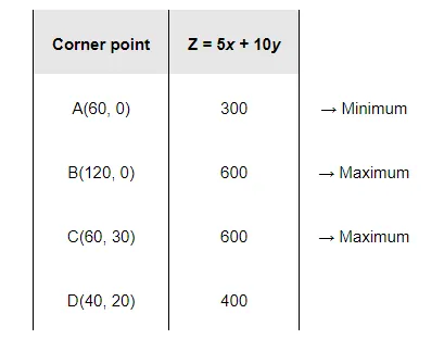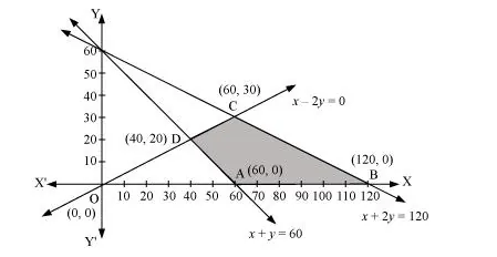 The corner points of the feasible region are A (60, 0), B (120, 0), C (60, 30), and D (40, 20).