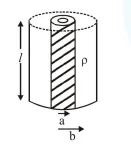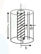 $\int \mathrm{dr}=\int_{\mathrm{a}}^{\mathrm{b}} \frac{\rho \mathrm{dr}}{2 \pi \mathrm{r} l} \Rightarrow \mathrm{r}=\frac{\rho}{2 \pi l} l \mathrm{n} \frac{\mathrm{b}}{\mathrm{a}}$