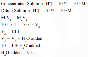 Question: How many litres of water must be added to 1 litre of an aqueous solution of $\mathrm{HCl}$ with a pH of 1 to create an aqueous solution with $\mathrm{pH}$ of 2 ?