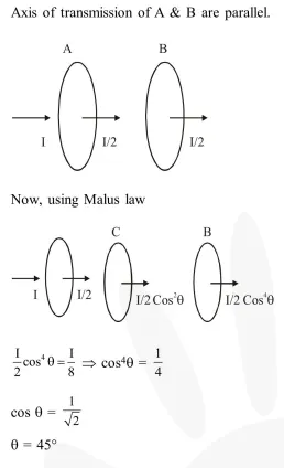 Unpolarized light of intensity I passes through an ideal polarizer A. Another identical polarizer $\mathrm{B}$ is placed behind $\mathrm{A}$. The intensity of light beyond $\mathrm{B}$ is found to be $\frac{1}{2}$. Now another identical polarizer $\mathrm{C}$ is placed between $\mathrm{A}$ and $\mathrm{B}$. The intensity beyond $\mathrm{B}$ is now found to be $\frac{\mathrm{I}}{8}$. The angle between polarizer $\mathrm{A}$ and $\mathrm{C}$ is :