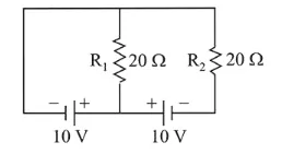 $\mathrm{i}_{1}=\frac{\mathrm{v}}{\mathrm{R}_{1}}=\frac{10}{20}=0.5 \mathrm{~A}$ and, $\mathrm{i}_{2}=0$
