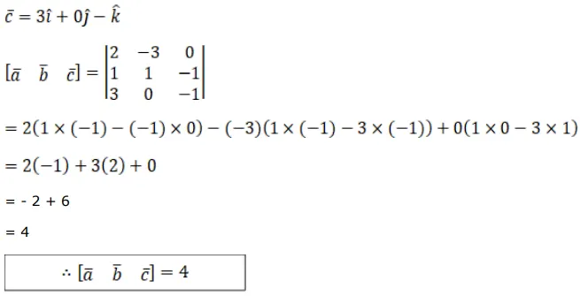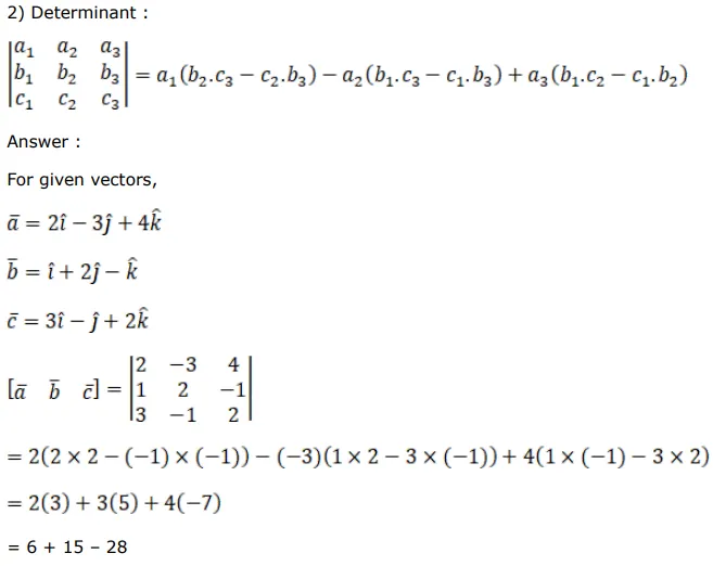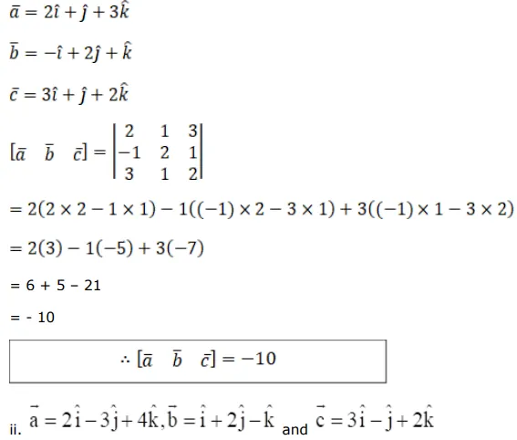 ii. $\overrightarrow{\mathrm{a}}=2 \hat{\mathrm{i}}-3 \hat{\mathrm{j}}+4 \hat{\mathrm{k}}, \overrightarrow{\mathrm{b}}=\hat{\mathrm{i}}+2 \hat{\mathrm{j}}-\hat{\mathrm{k}}$ and $\overrightarrow{\mathrm{c}}=3 \hat{\mathrm{i}}-\hat{\mathrm{j}}+2 \hat{\mathrm{k}}$
