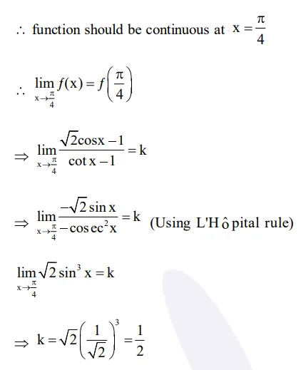 $f(x)=\left\{\begin{array}{cc}\frac{\sqrt{2} \cos x-1}{\cot x-1}, & x \neq \frac{\pi}{4} \\ \mathrm{k}, & \mathrm{x}=\frac{\pi}{4}\end{array}\right.$