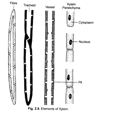 Xylem is made of four components - tracheids, vessels (tracheae), xylem fibres and xylem parenchyma.