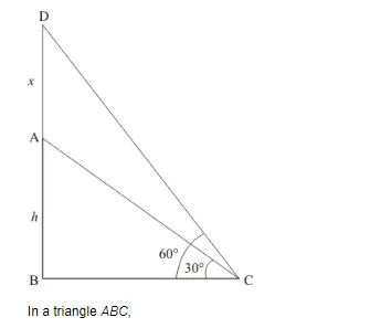 Let AB be the tower of height h and AD be the flag pole on tower. At the point 9m away from the foot of tower, the angle of elevation of the top and bottom of flag pole are 60° and 30°. Let AD = x, BC = 9 and