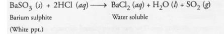 (c) White precipitate of barium sulphite reacts with dilute hydrochloric to form barium chloride and sulphur dioxide gas. Since barium chloride is