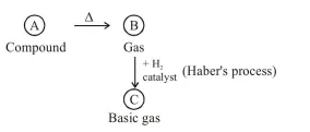 Basic gas $(\mathrm{C})$ must be ammonia $\left(\mathrm{NH}_{3}\right)$. It means (B) gas should be $\mathrm{N}_{2}$ which is formed by heating of compound (A).