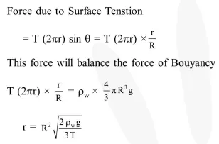 On heating water, bubbles being formed at the bottom of the vessel detatch and rise. Take the bubbles to be spheres of radius $R$ and making a circular contact of radius $r$ with the bottom of the vessel. If $\mathrm{r} \ll \mathrm{R}$, and the surface tension of water is $\mathrm{T}$, value of $r$ just before bubbles detatch is:(dencity of water is $\rho_{w}$ )