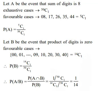 One ticket is selected at random from 50 tickets numbered $00,01,02, \ldots . ., 49$. Then the probability that the sum of the digits on the selected ticket is 8, given that the product of these digits is zero, equals