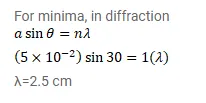Plane microwaves are incident on long list having a width of $5.0 \mathrm{~cm}$. Calculate the wavelength of the microwaves if the first diffraction minimum is formed at $\theta=30^{\circ}$.