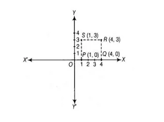 In point P( 1, 0), y-coordinate is zero, so it lies on X-axis. In point Q(4, 0), y-coordinate is zero so it lies on X-axis. In point S (1, 3), both coordinates are positive, so it lies in I quadrant. On plotting these points, we get the following graph.