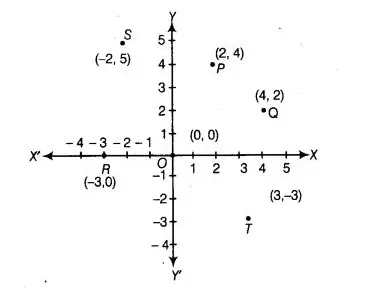 On plotting the given points on the graph, we get the points P(2,4), Q(4,2) R (-3, 0), S (-2, 5), T (3, – 3)and O (0 0)