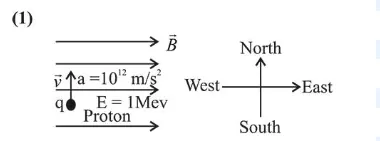 Proton with kinetic energy of $1 \mathrm{MeV}$ moves from south to north. It gets an acceleration of $10^{12} \mathrm{~m} / \mathrm{s}^{2}$ by an applied magnetic field (west to east). The value of magnetic field: (Rest mass of proton is $1.6 \times 10^{-27} \mathrm{~kg}$ )