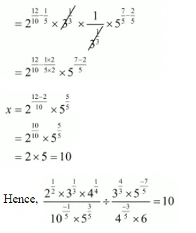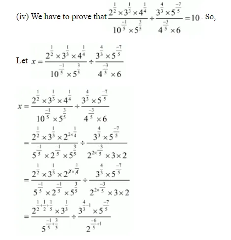 (iv) $\frac{2^{1 / 2} \times 3^{1 / 3} \times 4^{1 / 4}}{10^{-1 / 5} \times 5^{3 / 5}} \div \frac{3^{4 / 3} \times 5^{-7 / 5}}{4^{-3 / 5} \times 6}=10$