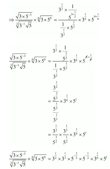 $\frac{\sqrt{3 \times 5^{-3}}}{\sqrt[3]{3^{-1} \sqrt{5}}} \times \sqrt[6]{3 \times 5^{6}}=\frac{\sqrt{3 \times \frac{1}{5^{3}}}}{\sqrt[3]{\frac{1}{3}} \sqrt{5}} \times \sqrt[6]{3 \times 5^{6}}$