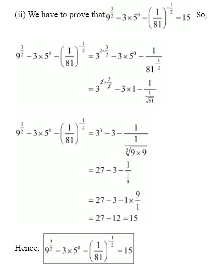 (ii) $9^{3 / 2}-3 \times 5^{0}-\left(\frac{1}{81}\right)^{-1 / 2}=15$