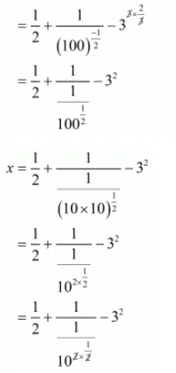 $x=\sqrt{\frac{1}{4}}+(0.01)^{\frac{-1}{2}}-(27)^{\frac{2}{3}}$