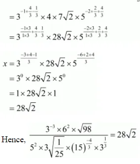 $x=\frac{3^{-3} \times 6^{2} \times \sqrt{98}}{5^{2} \times \sqrt[3]{\frac{1}{25}} \times(15)^{\frac{-4}{3}} \times 3^{\frac{1}{3}}}$