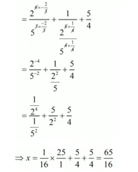 $x=\frac{2^{6 \times \frac{2}{3}}}{5^{3 \times \frac{-2}{3}}}+\frac{1}{\frac{2^{8 \times \frac{1}{4}}}{5^{4 \times \frac{1}{4}}}}+\frac{\sqrt{5 \times 5}}{\sqrt[3]{4 \times 4 \times 4}}$