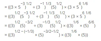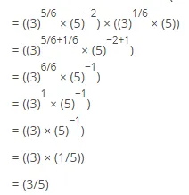 $=\left((3)^{\frac{3+2}{6}} \times(5)^{-\frac{4}{2}}\right) \times\left((3)^{\frac{1}{6}} \times(5)\right)$