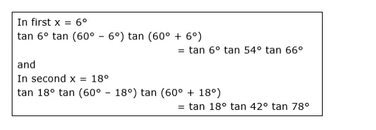 $=\frac{\left(\tan 6^{\circ} \tan 54^{\circ} \tan 66^{\circ}\right)\left(\tan 18^{\circ} \tan 42^{\circ} \tan 72^{\circ}\right)}{\tan 54^{\circ} \tan 18^{\circ}} \ldots$ (i)