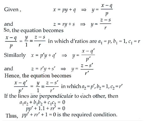 Prove that the lines x = py + q, z = ry + s and x = p¢y + q¢, z = r¢y + s¢ are perpendicular if pp¢ + rr¢ + 1 = 0.