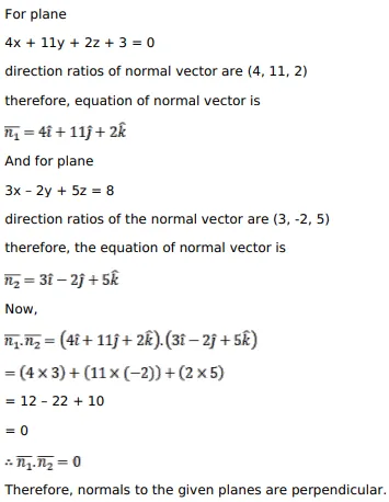 Prove that the normals to the planes $4 x+11 y+2 z+3=0$ and $3 x-2 y+5 z=8$ are perpendicular to each other.