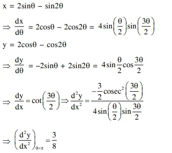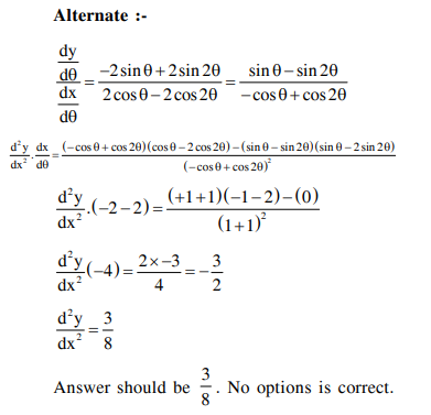Question: If $x=2 \sin \theta-\sin 2 \theta$ and $y=2 \cos \theta-\cos 2 \theta$, $\theta \in[0,2 \pi]$, then $\frac{\mathrm{d}^{2} \mathrm{y}}{\mathrm{dx}^{2}}$ at $\theta=\pi$ is :