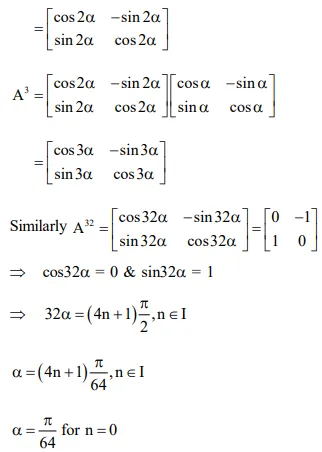 Let $\mathrm{A}=\left(\begin{array}{cc}\cos \alpha & -\sin \alpha \\ \sin \alpha & \cos \alpha\end{array}\right),(\alpha \in \mathrm{R})$ such that $A^{32}=\left(\begin{array}{cc}0 & -1 \\ 1 & 0\end{array}\right) .$ Then a value of $\alpha$ is