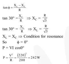 In a series $\mathrm{LCR}$ circuit $\mathrm{R}=200 \Omega$ and the voltage and the frequency of the main supply is $220 \mathrm{~V}$ and $50 \mathrm{~Hz}$ respectively. On taking out the capacitance from the circuit the current lages behind the voltage by $30^{\circ}$. On taking out the inductor from the circuit the current leads the voltage by $30^{\circ}$. The power dissipated in the LCR circuit is :