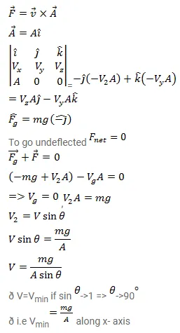 A force $\vec{F}=\vec{v} \times \vec{A}$ is exerted on a particle in addition to the force of gravity, where $\vec{v}$ is the velocity of the particle and $\vec{A}$ is a constant vector in the horizontal direction. With what minimum speed a particle of mass me projected so that it continues to move undeflected with a constant velocity?