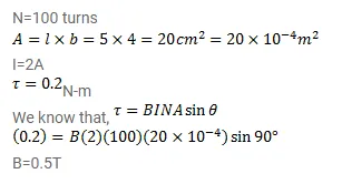 A rectangular coil of 100 turns has length $5 \mathrm{~cm}$ and width $4 \mathrm{~cm}$. It is placed with its plane parallel to a uniform magnetic field and a current of $2 \mathrm{~A}$ is sent through the coil. Find the magnitude of the magnetic field $\mathrm{B}$, if the torque acting on the coil is $0.2 \mathrm{~N}-\mathrm{m}$.