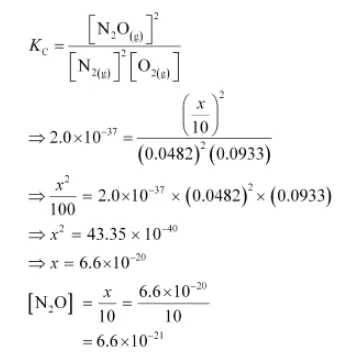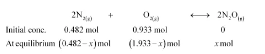 $\left[\mathrm{N}_{2}\right]=\frac{0.482-x}{10},\left[\mathrm{O}_{2}\right]=\frac{0.933-x / 2}{10},\left[\mathrm{~N}_{2} \mathrm{O}\right]=\frac{x}{10}$