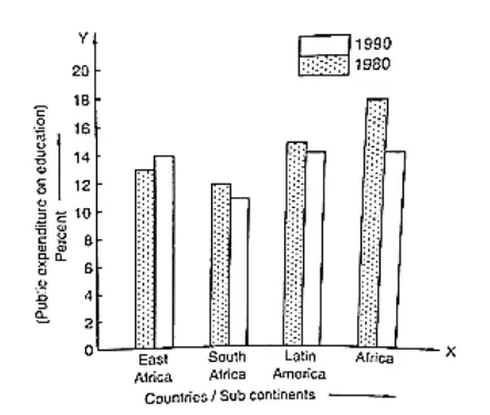 (i) The bar graph represents the public expenditure on education in different countries and sub continents in the years 1980 and 1990.