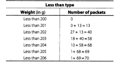 So, the total number of packets less than 201 is 0 + 13 = 13. We say that, the cumulative frequency of the class 200-201 is 13. Similarly, for other