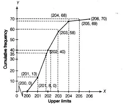 To draw the less than type ogive, we plot the points (200, 0), (201, 13), (202, 40) (203, 58), (204, 68), (205, 69) and (206, 70) on the paper and
