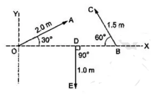 Refer to the figure. (a) Find the magnitude, (b) $x$ and $y$ components and (c) the angle with the $\mathrm{X}$-axis of the resultant of $\overrightarrow{O A}, \overrightarrow{B C}$ and $\overrightarrow{D E}$.