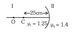 Region I and II are separated by a spherical surface of radius $25 \mathrm{~cm}$. An object is kept in region $\mathrm{I}$ at a distance of $40 \mathrm{~cm}$ from the surface. The distance of the image from the surface is :