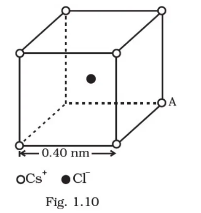 represents a crystal unit of cesium chloride, CsCl. The cesium atoms, represented by open circles are situated at the corners of a cube of side 0.40 nm, whereas a Cl atom is situated at the centre of the cube. The Cs atoms are deficient in one electron while the Cl atom carries an excess electron.