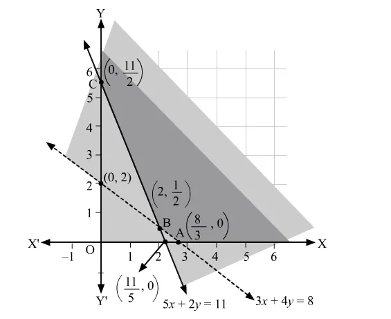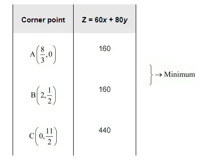 The corner points of the feasible region are $\mathrm{A}\left(\frac{8}{3}, 0\right), \mathrm{B}\left(2, \frac{1}{2}\right)$, and $\mathrm{C}\left(0, \frac{11}{2}\right)$.