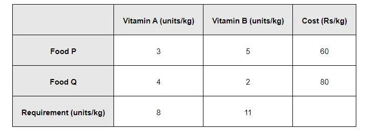 Reshma wishes to mix two types of food P and Q in such a way that the vitamin contents of the mixture contain at least 8 units of vitamin A and 11 units of vitamin B