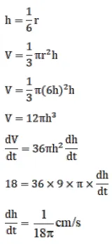 Sand is pouring from a pipe at the rate of $18 \mathrm{~cm}^{3} / \mathrm{s} .$ The falling sand forms a cone on the ground in such a way that the height of the cone is one-sixth of the radius of the base. How fast is the height of the sand cone increasing when its height is $3 \mathrm{~cm}$ ?