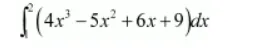 $\int\left(4 x^{3}-5 x^{2}+6 x+9\right) d x=4\left(\frac{x^{4}}{4}\right)-5\left(\frac{x^{3}}{3}\right)+6\left(\frac{x^{2}}{2}\right)+9(x)$