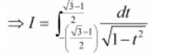 $\begin{aligned} \Rightarrow I &=2 \int_{0}^{\frac{\sqrt{3}-1}{2}} \frac{d t}{\sqrt{1-t^{2}}} \\ &=\left[2 \sin ^{-1} t\right]_{0}^{\frac{\sqrt{3}-1}{2}} \\ &=2 \sin ^{-1}\left(\frac{\sqrt{3}-1}{2}\right) \end{aligned}$