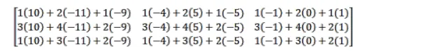 Matrix $A B=\left[\begin{array}{ccc}1 & 2 & 1 \\ 3 & 4 & 2 \\ 1 & 3 & 2\end{array}\right] \times\left[\begin{array}{ccc}10 & -4 & -1 \\ -11 & 5 & 0 \\ 9 & -5 & 1\end{array}\right]=$