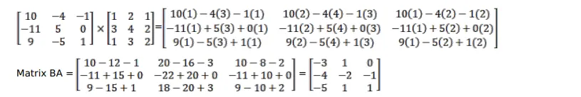Given : $\mathrm{A}=\left[\begin{array}{lll}1 & 2 & 1 \\ 3 & 4 & 2 \\ 1 & 3 & 2\end{array}\right]$ and $\mathrm{B}=\left[\begin{array}{ccc}10 & -4 & -1 \\ -11 & 5 & 0 \\ 9 & -5 & 1\end{array}\right]$