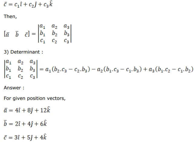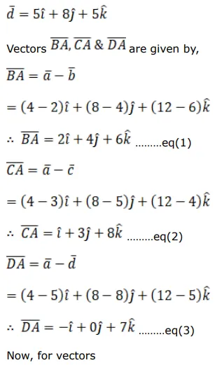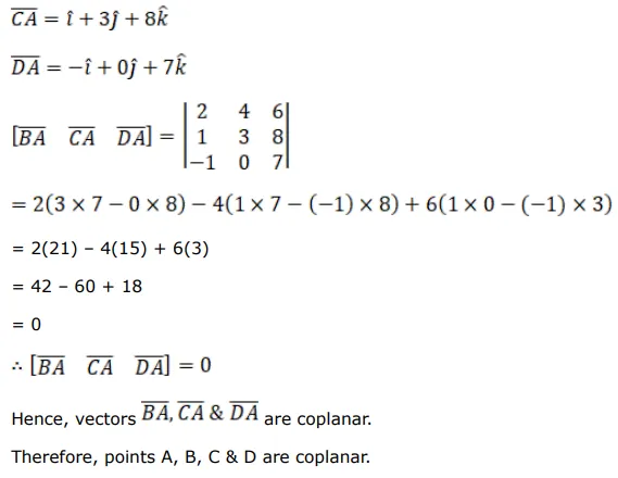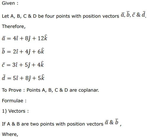 Show that the four points with position vectors $(4 \hat{\mathrm{i}}+8 \hat{\mathrm{j}}+12 \hat{\mathrm{k}}),(2 \hat{\mathrm{i}}+4 \hat{\mathrm{j}}+6 \hat{\mathrm{k}})$ $(3 \hat{j}+5 \hat{j}+4 \hat{k})$ and $(5 \hat{\mathrm{i}}+8 \hat{\mathrm{j}}+5 \hat{\mathrm{k}})$ are coplanar.