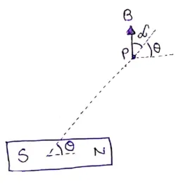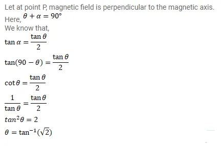 Show that the magnetic field at a point due to a magnetic dipole is perpendicular to the magnetic axis if the line joining the point with the center of the dipole makes an angle of $\tan ^{-1}(\sqrt{2})$ with the magnetic axis.