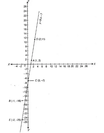 Now, we plot the given points A (1,2), B (-1, -16) and C (0, -7) on the graph paper. We see that all the points lie on DE line.