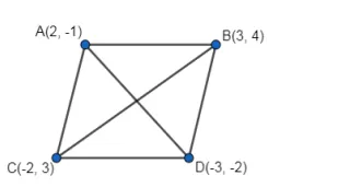 Show that the points A(2, -1), B(3, 4), C(-2, 3) and D(-3, -2) are the vertices of a rhombus.